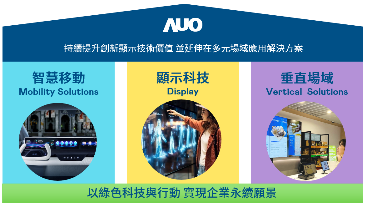 我們持續推動「雙軸轉型」,在精進顯示技術附加價值(Go Premium),與深化垂直市場應用(Go Vertical)的策略下,對應pg电子的優勢競爭力與趨勢,我們奠定顯示技術、智慧移動、垂直場域三大永續營運支柱,在顯示技術領域的根基之上,延伸布局多元場域應用解決方案。將先進顯示科技助力智慧移動及垂直場域發展,並以綠色科技與行動為實踐,在轉型之路上貫徹永續經營之願景。